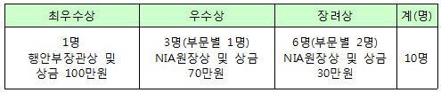 행정안전부는 인터넷중독 확산 방지와 대국민 인식제고를 위해 일반 국민을 대상으로 인터넷 중독 피해 사례 및 극복 수기 공모전을 다음과 같이 개최하오니 많은 참여바랍니다. o 행 사 명 : 인터넷 중독 예방 및 극복 수기 공모전 o 주 최 : 행정안전부 o 주관 / 후원 : 한국정보화진흥원 / 매일경제신문사 o 응모자격 : 인터넷 중독자․위험자 개인 및 가족, 상담사 등 전 국민 o 응모기간 : ‘09.11.15(월) ~ 12.5(월), 21일간 o 응모부문 : 초중고등부 / 대학부 / 일반부 o 공모내용 - 인터넷 중독으로 발생된(학교, 가정 등에서의) 문제 극복 사례 - 개인이 직접 중독을 체험한 수기나 예방 및 극복 비법 - 가정생활 속에서 자녀의 인터넷 중독 예방 및 극복 사례 - 학교 선생님의 학생지도 중 인터넷 중독 예방 및 극복 지도 수기 - 올바른 인터넷/게임 사용문화 정착 및 중독 예방법 등 o 양식 다운로드 : 정보문화포털(www.iapc.or.kr) 공지사항 게시판 참조 o 응모방법 : E-mail(15990075@nia.or.kr)로 응모 o 원고분량 : A4 5매 내외(한글, 글자크기 12point, 줄간격 180%) o 기 타 - 원고 제출시 인적사항 및 연락처 반드시 기재 - 당선작 발표 : 12월 2주, 한국정보화진흥원 홈페이지(www.nia.or.kr) o 시상내역 o 접수 및 문의처 - 한국정보화진흥원 미디어중독대응부 T : 02-2131-0374, e-mail : 15990075@nia.or.kr |